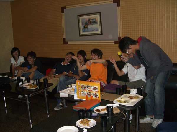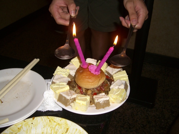就在KTV裡面我收到了我的生日蛋糕,成份是水蜜桃蛋糕(好樂迪貨)巧克力蛋糕(好樂迪貨)+沒烤過的奶油餐包(好樂迪貨)+炒麵(好樂迪貨)+辣死人不償命的三杯燒肉(好樂迪貨)+兩根蠟燭